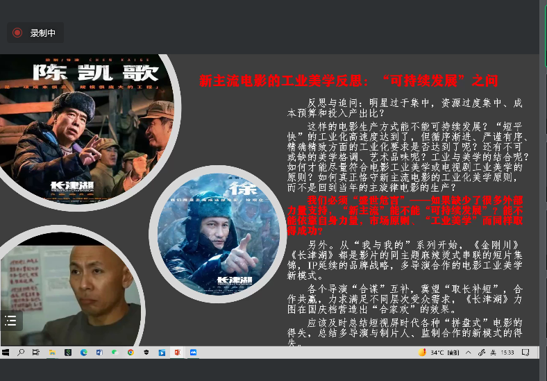 5月27日下午,我院邀请北京大学文学博士、北大影视戏剧研究中心主任、“长江学者”特聘教授、全国广播电视与网络视听行业“领军人才”陈旭光教授做客“鸣泉”学术沙龙,通过腾讯会议给我院师生做题为《近年来中国新主流电影的发展态势与美学反思》的学术讲座。校党委委员、统战部长、民族学院院长王赳主持。