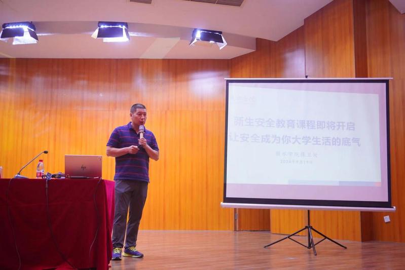 随后,胡永军就国家安全、消防安全、反诈骗、食品安全等方面展开讲解。针对目前高发的电信网络诈骗问题,胡永军通过真实案例揭示了诈骗分子的常用伎俩及其严重危害,并详细说明了如何避免成为诈骗的受害者。他呼吁新生们要时刻保持警惕,提升自我防范意识,共同营造一个安全、和谐的校园环境。