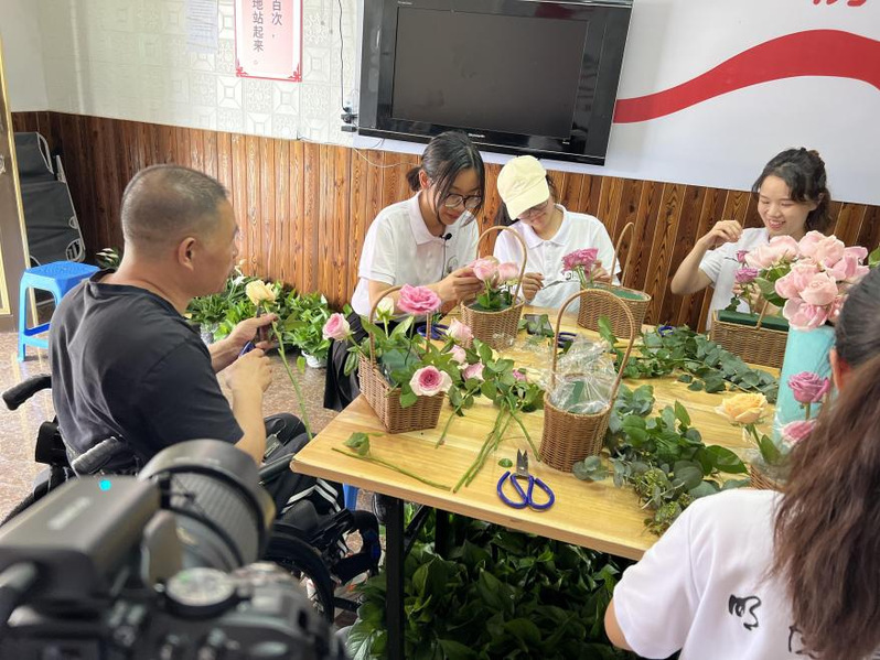 为进一步了解残疾人创业状况,团队来到了南明山街道明都残疾人之家,队员与负责人徐志飞先生、市残联汪主任以及建行领导们共同探讨了残疾人就业创业的话题。徐先生除了是残疾人之家的负责人之外,也是一名经营花卉店铺的花艺师。他虽然行动不便,但凭借自身努力获得了事业的成功。徐先生表示他会将花卉产业继续发扬光大,尽己所能帮助更多残疾人就业。活动最后,徐先生特意为团队准备了花艺课体验插花。在授课期间,徐先生讲起了自己的故事,团队成员深受感动。