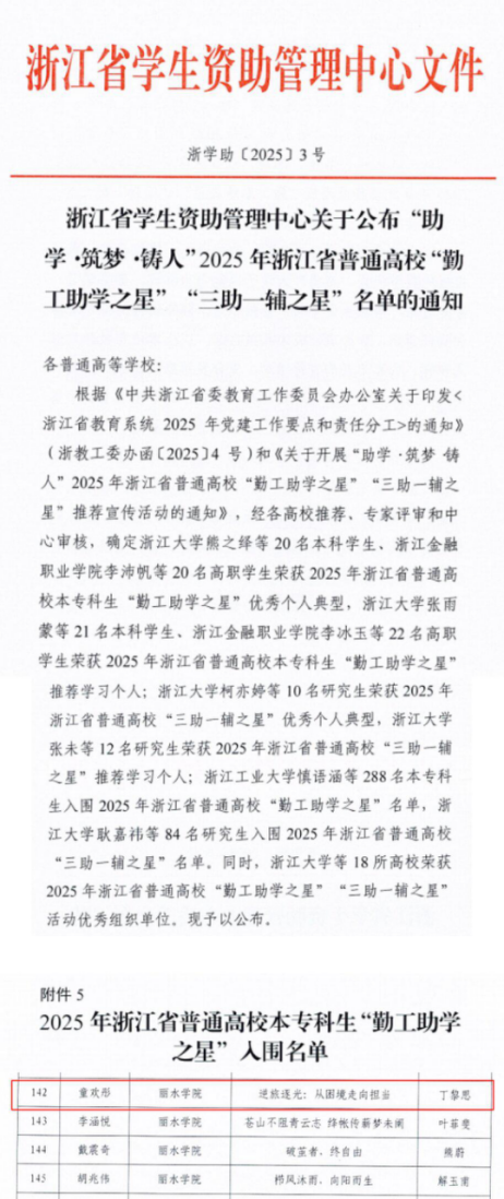 近日,“助学·筑梦·铸人”2025年浙江省普通高校“勤工助学之星”评选结果揭晓,我校人文学院中文系2022级学子童欢彤凭借自立自强、矢志奋斗的卓越表现,携作品《逆旅逐光:从困境走向担当》成功入围本年度浙江省普通高校本专科生“勤工助学之星”,为我院学生工作再添一笔!
