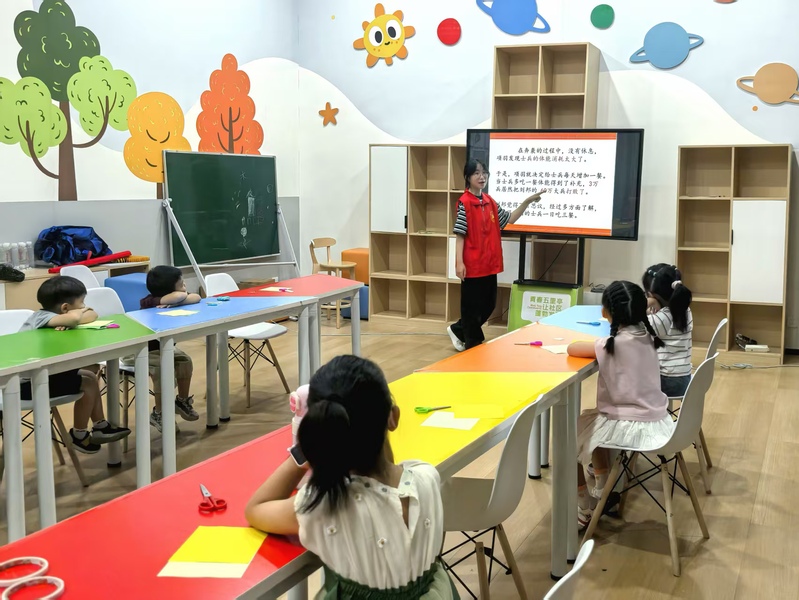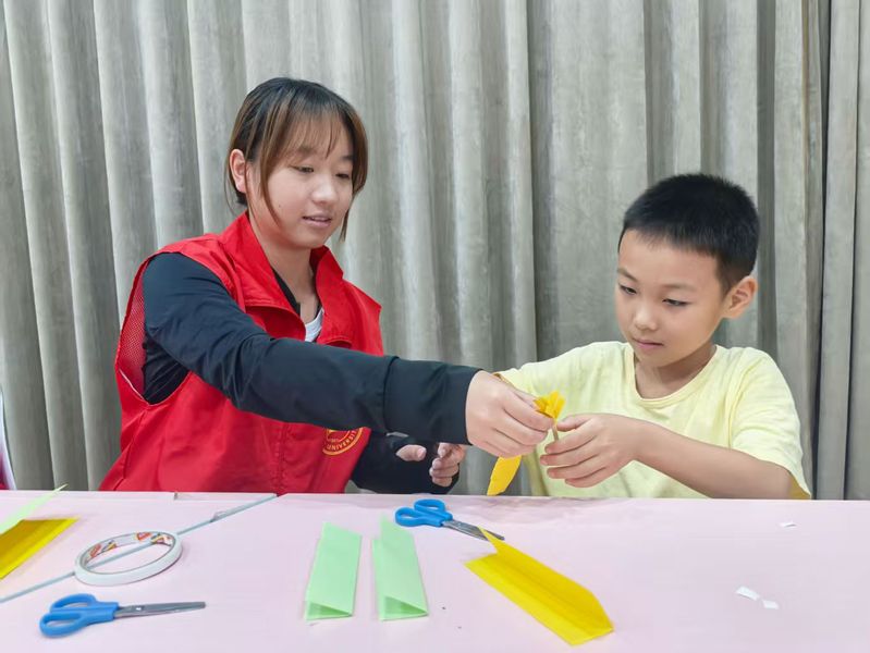 活动尾声的自由创作环节,志愿者指引儿童利用彩纸制作手工麦穗摆件,将爱粮惜粮的认知转化为可触摸的纪念物。一位孩子兴奋地表示会将这件麦穗作品作为提醒,督促自己践行光盘行动。