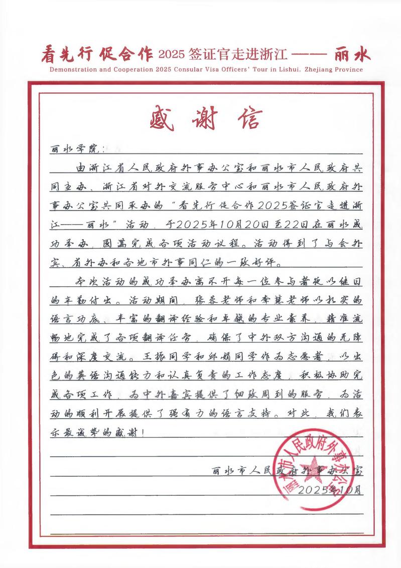 近日,丽水市人民政府外事办公室向我院发来感谢信,对我院张蓉、李慧两位教师和王振、邱娟两位同学在“看先行 促合作2025签证官走进浙江——丽水”活动中作出的卓越贡献表示高度肯定和衷心感谢。