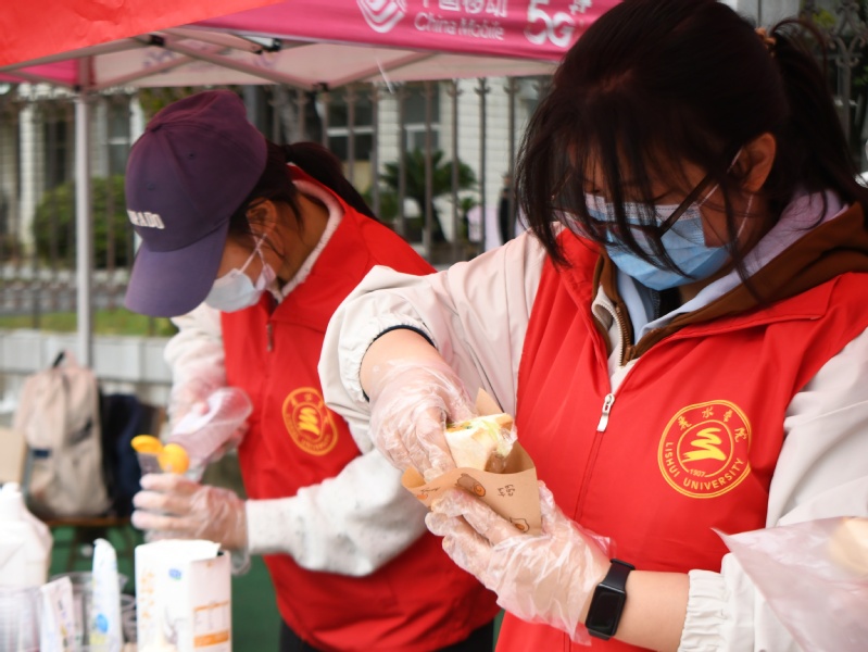 “同学,需要来一份刚做好的三明治吗?每一份都是爱心。”身着红马甲的志愿者轻声招呼,手中熟练地准备着食材。从严格筛选的原料采购,到一丝不苟的清洗制作,每一个环节都承载着他们对食品安全与公益初心的双重坚守。新鲜制作的三明治、醇香四溢的温热奶茶……这些看似平常的饮品与食物,在志愿者的手中,化作连接赛场与公益的温暖纽带。而“每购买一杯,即捐赠一份爱心”的公益模式,更是将每一次寻常的交易,升华为一次善意的传递,吸引了众多师生驻足参与、慷慨支持。