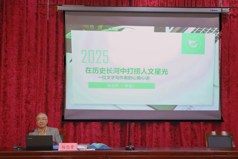 本次讲座聚焦于文学创作的路径方法与人文精神的内核价值,探讨如何从历史与传统中汲取养分以实现有效传承。讲座中,杨忠贵以生动的个人经历为引,将文学经典与创作理论巧妙融合。他强调,读书的根本在于“培根铸魂”,不仅要读懂文字,更要读出背后作者的精神,从而塑造自身人格。他鼓励学生从屈原、范仲淹、朱自清等文人先贤身上汲取精神力量,将其融入自身的文学创作与人生选择,走出一条属于自己的道路。