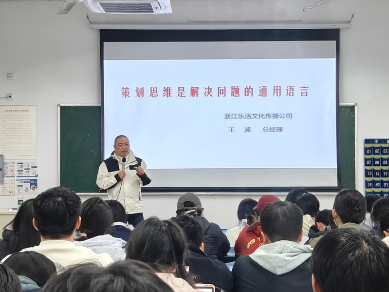 为深化校企合作,提升学生策划思维与实践能力,11月29日晚,校级校企合作课程《文案策划》的企业合作方代表——浙江乐活文化传播有限公司总经理王波应邀来访,为我院师生带来一场关于策划思维的专题讲座。本次活动由《文案策划》主讲教师丁少杰主持,课程修读学生共90余人参与。