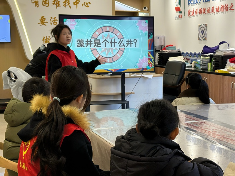 志愿者以有趣的谜语开启敦煌之旅,辅以九色鹿的经典故事引出主题,激起小朋友们的好奇心。志愿者配合藻井的视频画面轻声解说,带领孩子们理解纹样中蕴含的东方美学与民族智慧。在问答环节中,志愿者巧妙引导孩子们进行观察与思考。一系列精心设计的互动,不仅让孩子们在欢声笑语中掌握了藻井艺术的基本特征,更让他们深刻感受到中华文化的博大精深,初步建立起对自身文化根源的认同感。