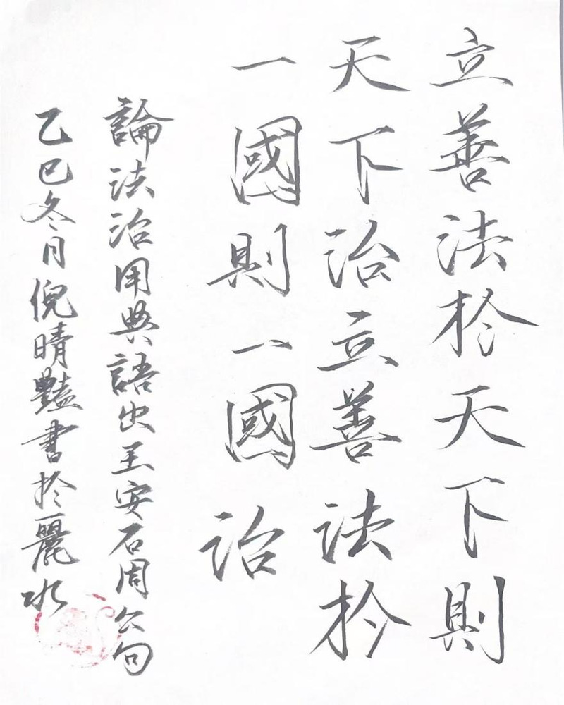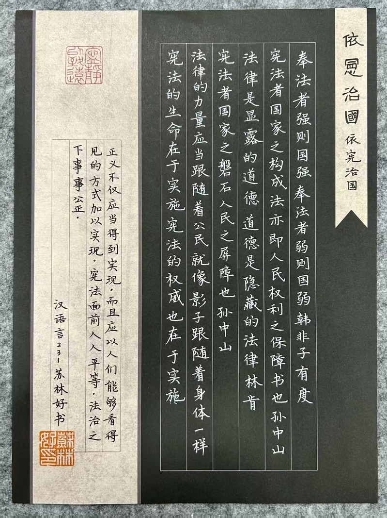 此次活动采用线上征稿的形式,紧扣宪法核心精神,引导青年学生在书写中感悟宪法内涵与坚定法治信仰。活动启动后,全院学生踊跃参与,一批兼具书法美感与法治温度的作品相继涌现,有的以楷书端正文风诠释宪法的庄重性,有的以行书灵动笔势传递法治的生命力,字里行间皆流露着青年学子对“依宪治国”理念的深刻认同。参赛选手以三笔字为载体,或书写王安石《周公》中“立善法以治天下”的经典论述,或誊写韩非子、孙中山等先贤的法治名言,或创作原创文稿。一笔一划间,既见笔墨功底的整齐铿锵,更显对宪法的尊崇与敬畏。